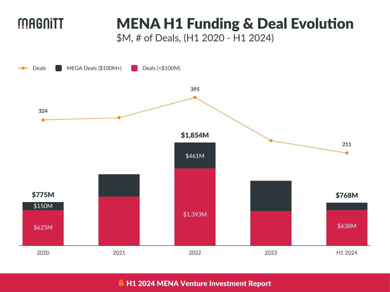 حصلت الشركات الناشئة في منطقة الشرق الأوسط وشمال أفريقيا على إجمالي تمويل قدره 768 مليون دولار في النصف الأول من عام 2024، وهو ما يمثل انخفاضًا بنسبة 34٪ مقارنة بالنصف الأول من عام 2023.