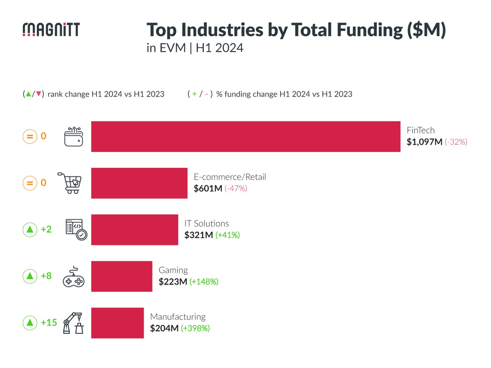 وتصدرت منطقة جنوب شرق آسيا (SEA) المشهد باجمالي تمويل بلغ 2.209 مليار دولار، على الرغم من انخفاض بنسبة 31٪ مقارنة بالنصف الأول من عام 2023، واستحوذت على 64٪ من إجمالي تمويل EVM في النصف الأول من عام 2024.