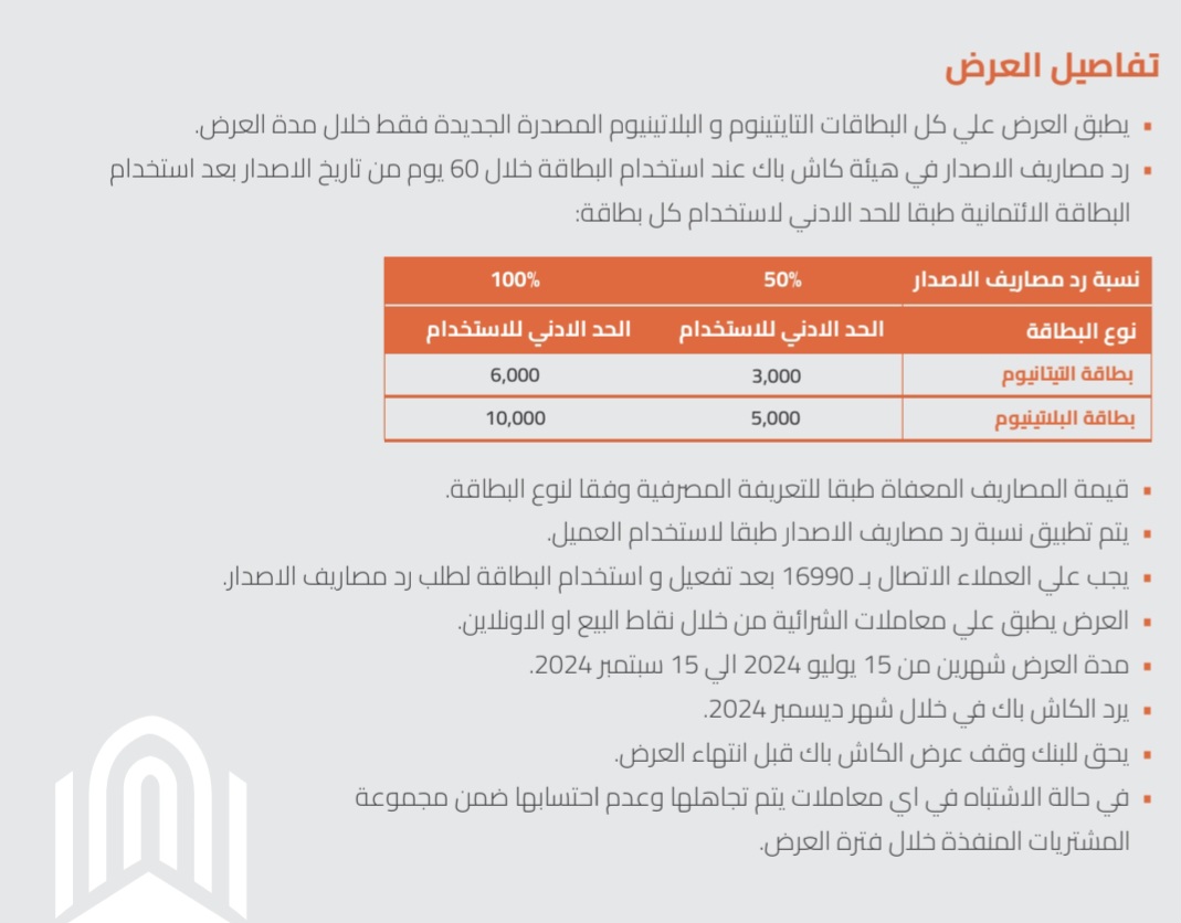 وأكد أنه يحق للبنك وقف عرض الكاش باك قبل انتهاء العرض،و في حالة الاشتباه في اي معاملات يتم تجاهلها وعدم احتسابها ضمن مجموعة المشتريات المنفذة خلال فترة العرض.