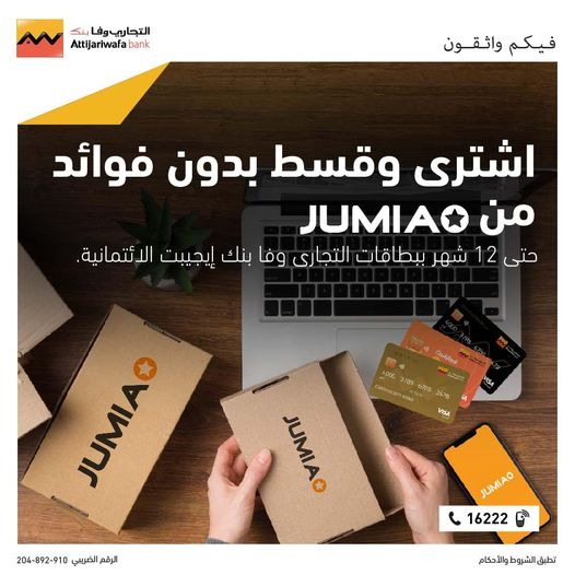 يمنح هذا العرض الحصري عملاء التجاري وفا بنك مصر إمكانية تقسيط مشترياتهم من جوميا لأجل يصل إلى 12 شهرًا بدون أي فوائد عند استخدام أي من بطاقاتهم الائتمانية.