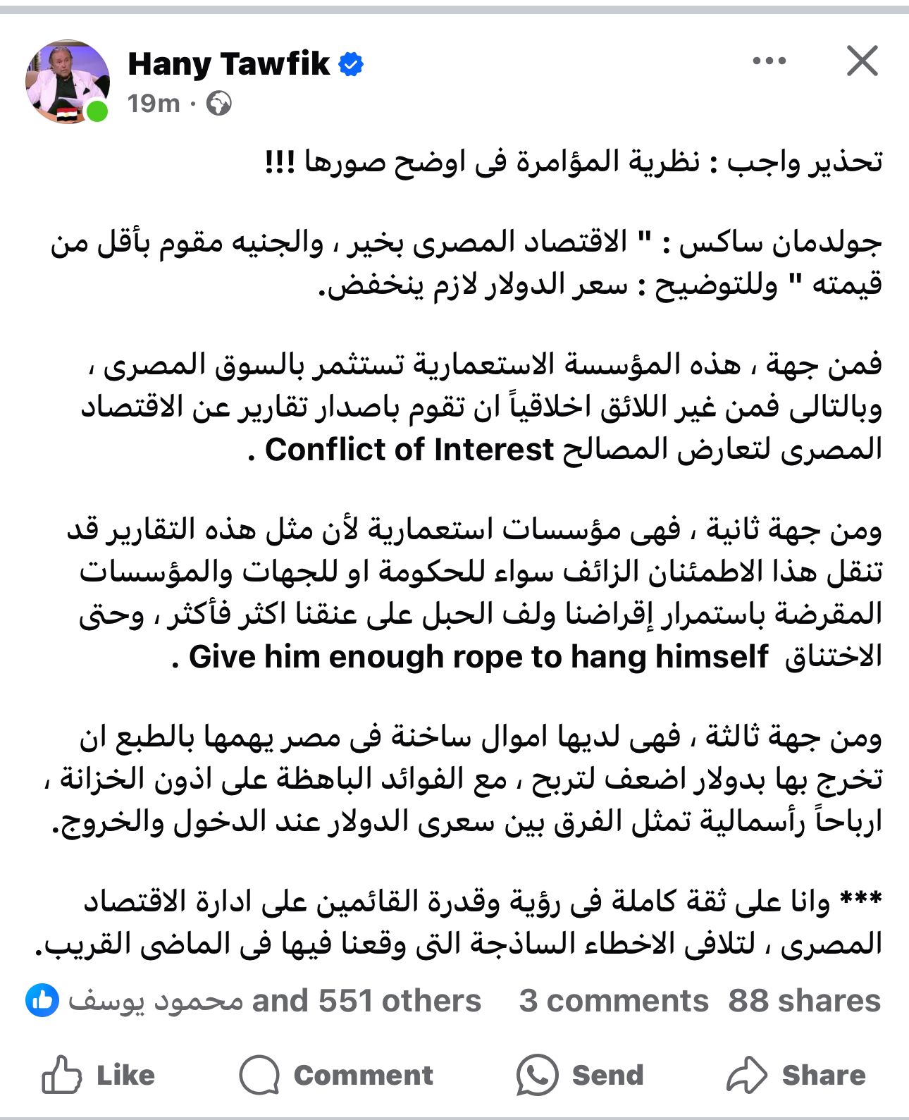 حذر الخبير الإقتصادي هاني توفيق من التقارير التي تصدرها مؤسسة جولدمان ساكس عن الاقتصاد المصري وعن سعر الصرف.