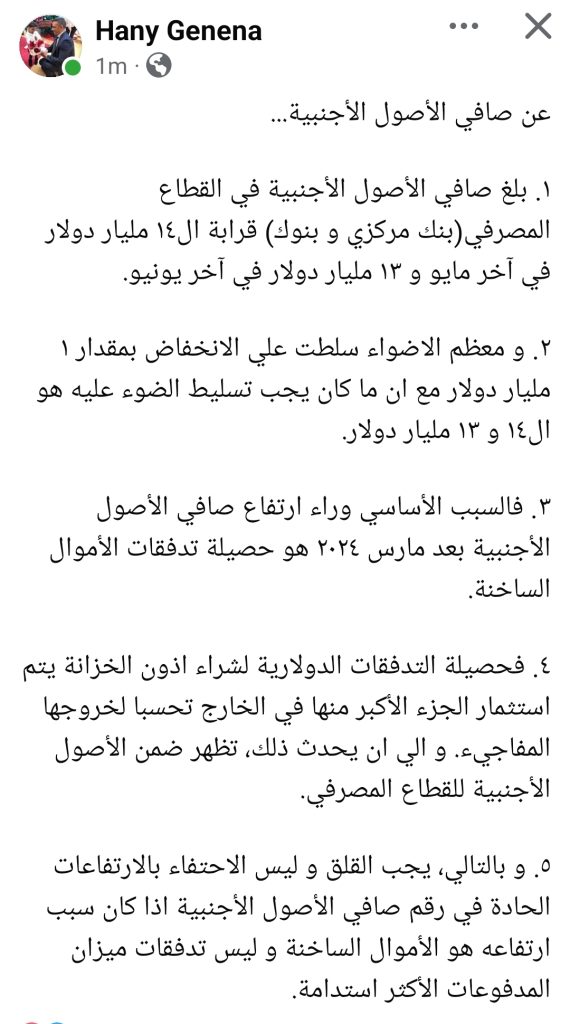 قال الخبير الإقتصادي هاني جنينه إن صافي الأصول الأجنبية في القطاع المصرفي المصري (بنك مركزي و بنوك) بلغ قرابة ال 14 مليار دولار في آخر مايو و 13 مليار دولار في آخر يونيو.
