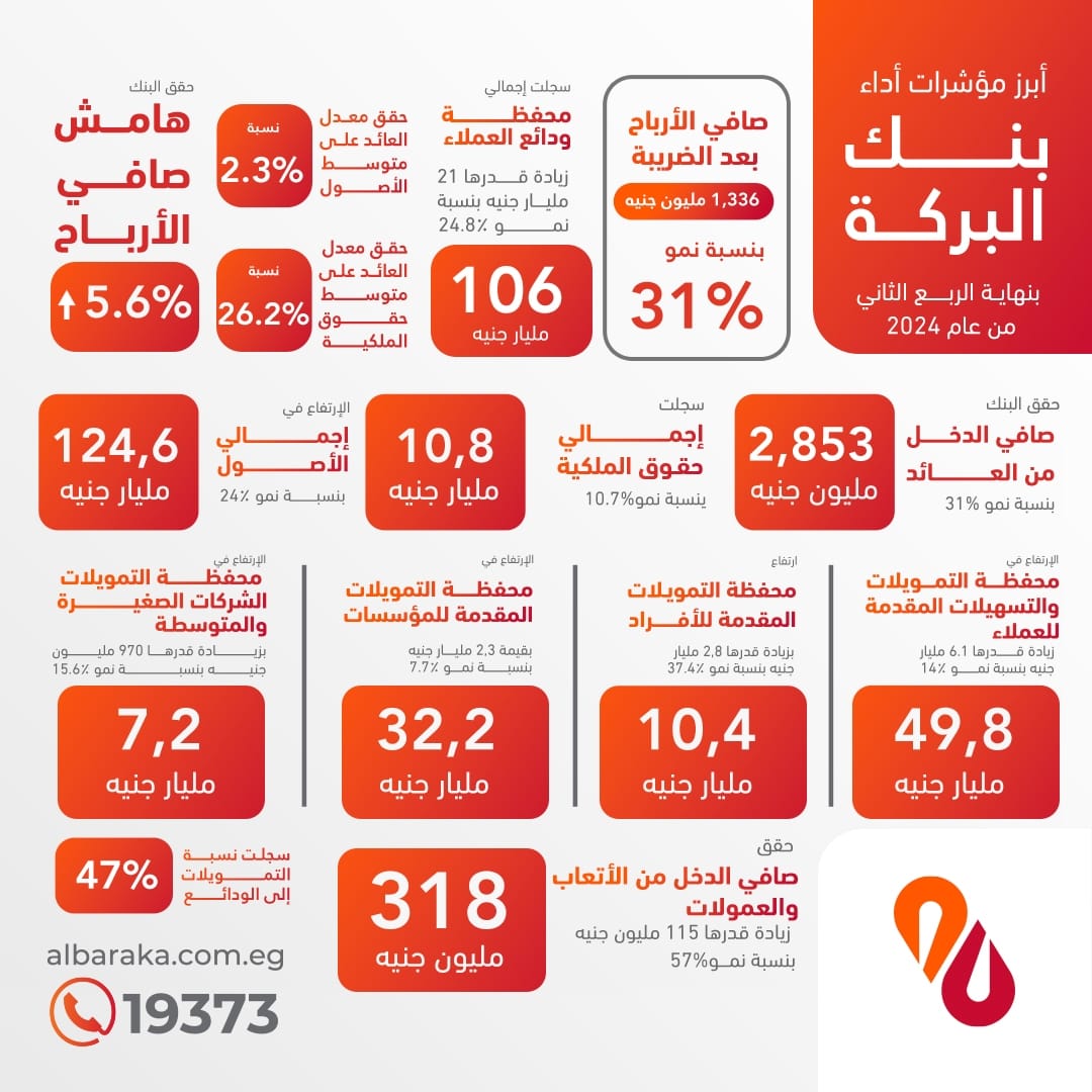 من جانبه قال حازم حجازي، الرئيس التنفيذي ونائب رئيس مجلس إدارة بنك البركة، “نعتز في بنك البركة بما حققناه من أداء متميز في الربع الثاني من عام 2024، بما يعكس التزامنا الثابت بتقديم أفضل المنتجات والخدمات لعملائنا؛ تحقيقاً للنمو المستدام.