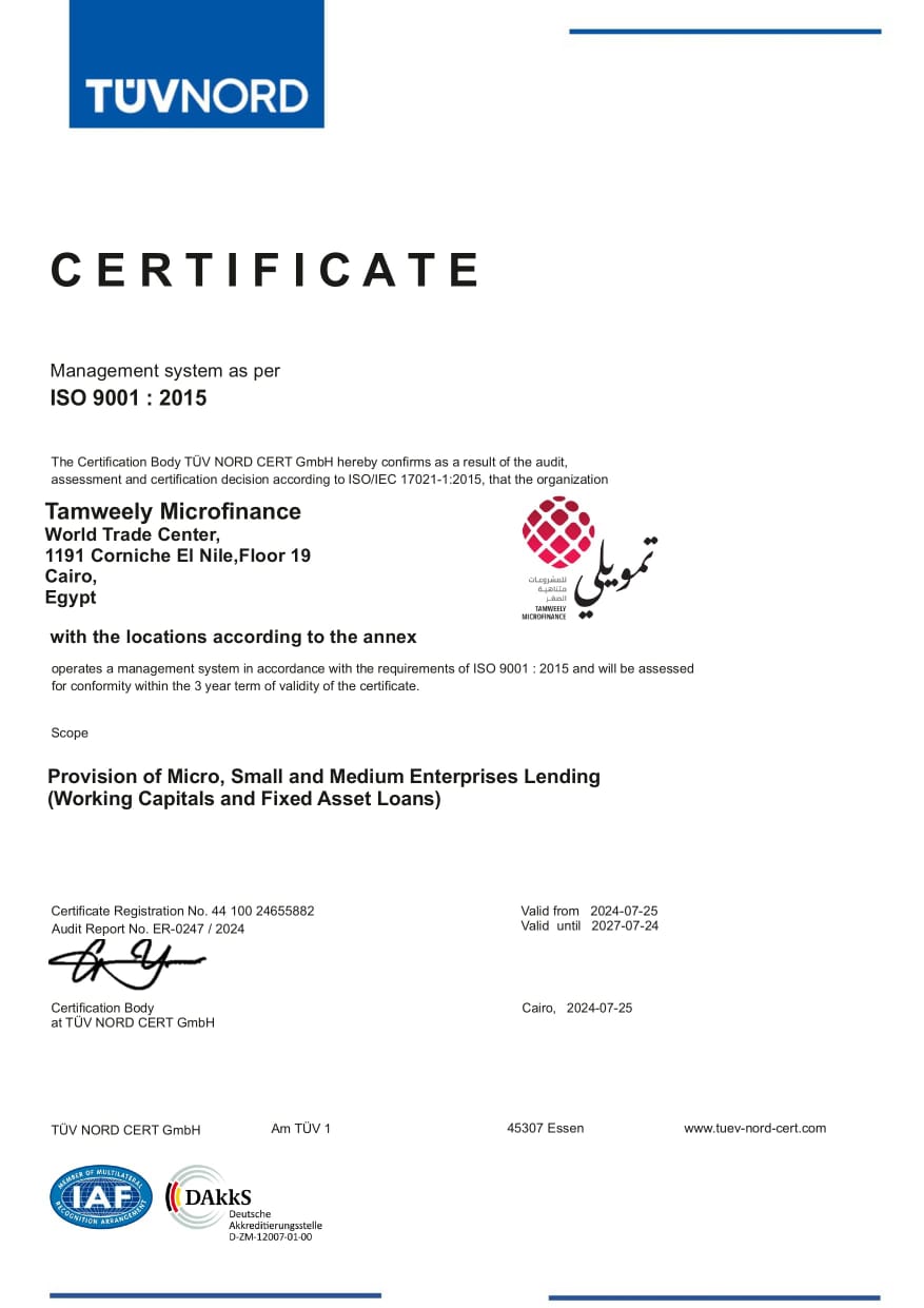 حصدت شركة تمويلي للمشروعات متناهية الصغر شهادة الأيزو 9001:2015 الخاصة بإدارة الجودة في المؤسسات حيث أصبحت الشركة معتمدة دولياً لدى جهة الاعتمادات الدولية (IAF).