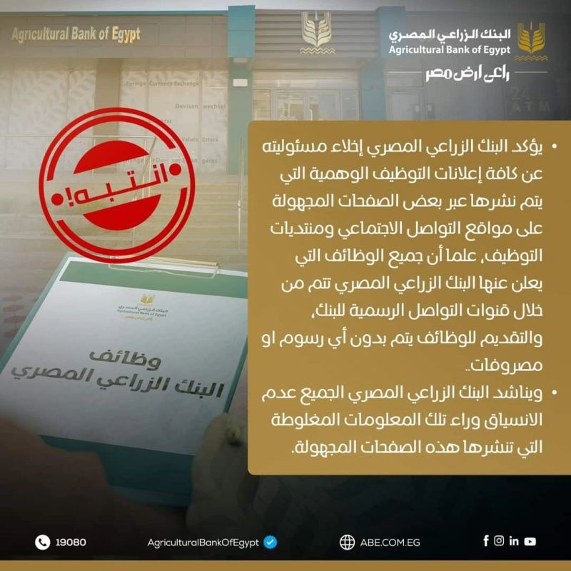 أكد البنك الزراعي المصري، في بيان رسمي، إخلاء مسؤوليته عن كافة إعلانات التوظيف الوهمية المنتشرة على مواقع التواصل الاجتماعي ومنتديات التوظيف.
