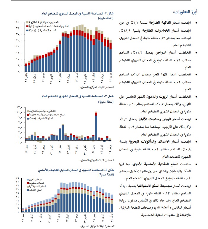 كما شهد المعدل السنوي للتضخم الأساسي تباطؤا في يوليو 2024 ليسجل 24.4% مقابل 26.6% في يونيو 2024 ، وهو أدنى معدل له منذ ديسمبر 2022. ويأتي ذلك التراجع للشهر الخامس على التوالي متسقا مع المعدل الشهري للتضخم الأساسي الذي سجل سالب 0.5% في يوليو 2024 مقابل 1.3% خلال ذات الشهر من عام 2023.