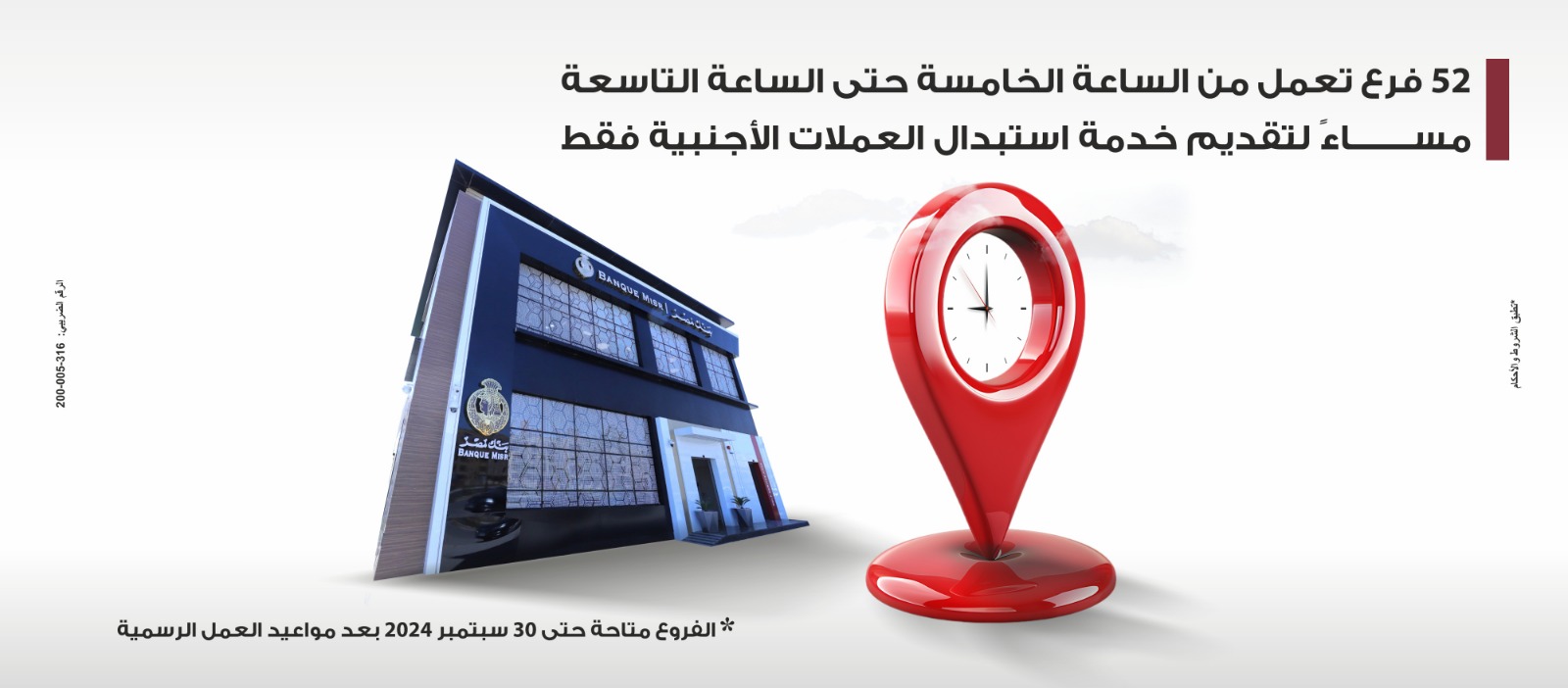 أعلن بنك مصر عن تخصيص 52 فرعًا تعمل من الساعة الخامسة مساءً وحتى التاسعة مساءً لتقديم خدمة استبدال العملات الأجنبية حتى 30 سبتمبر 2024 بعد مواعيد العمل الرسمية.