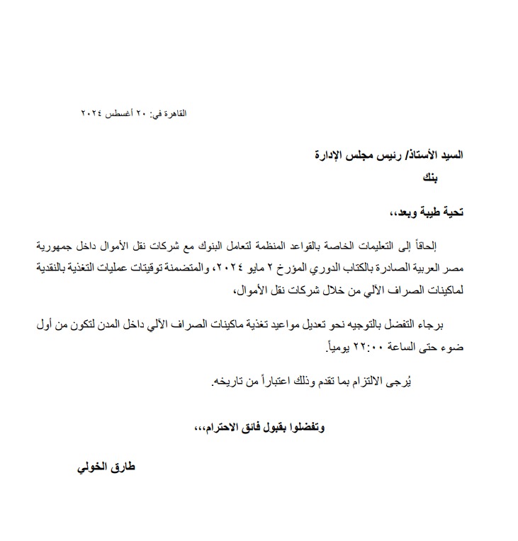 ويأتى هذا إلحاقاً إلى التعليمات الخاصة بالقواعد المنظمة لتعامل البنوك مع شركات نقل الأموال داخل جمهورية مصر العربية الصادرة بالكتاب الدوري المؤرخ 2 مايو الماضى ، والمتضمنة توقيتات عمليات التغذية بالنقدية لماكينات الصراف الآلي من خلال شركات نقل الأموال.