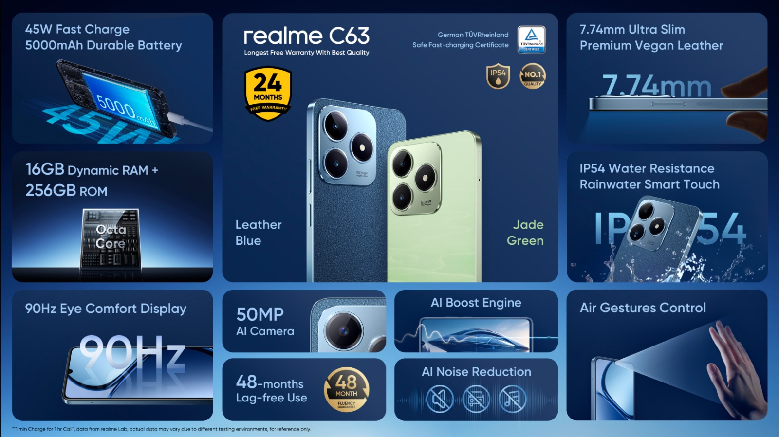 يتميز هاتف realme C63 بتقديم مميزات استثنائية للمستخدمين، بالإضافة إلى تصميم أنيق مصنوع من جلد نباتي صديق للبيئة كما أنه يمتلك مواصفات قوية تجعله يتصدر فئته السوقية بلا منازع.