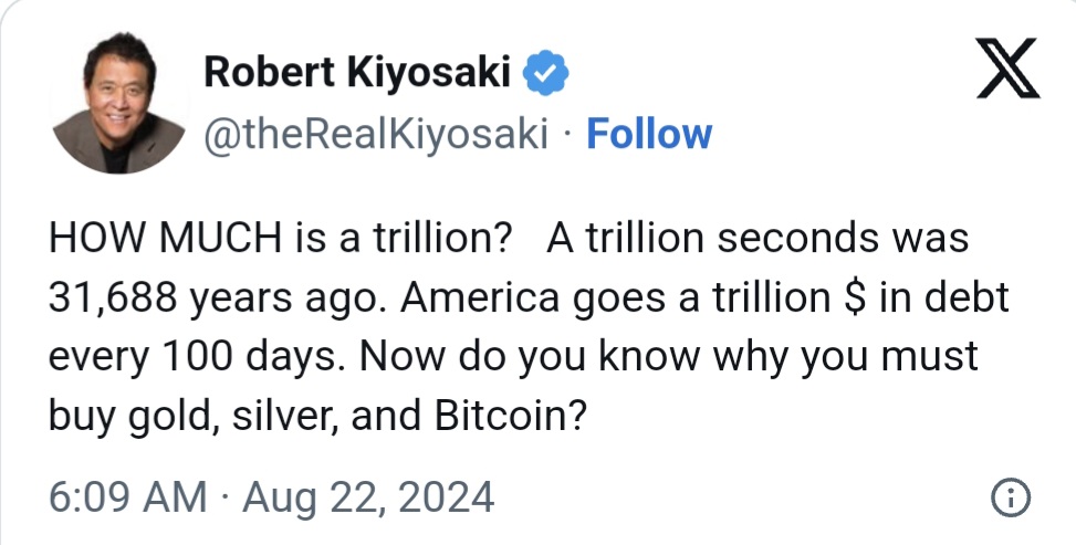 نصح المؤلف الشهير، روبرت كيوساكي، مؤلف كتاب الأب الغني والأب الفقير، المستثمرين بشراء الذهب والفضة والبيتكوين وسط تزايد الديون في الولايات المتحدة. حيث أدلى كيوساكي بهذا التصريح في منشور حديث شاركه على حسابه على X.