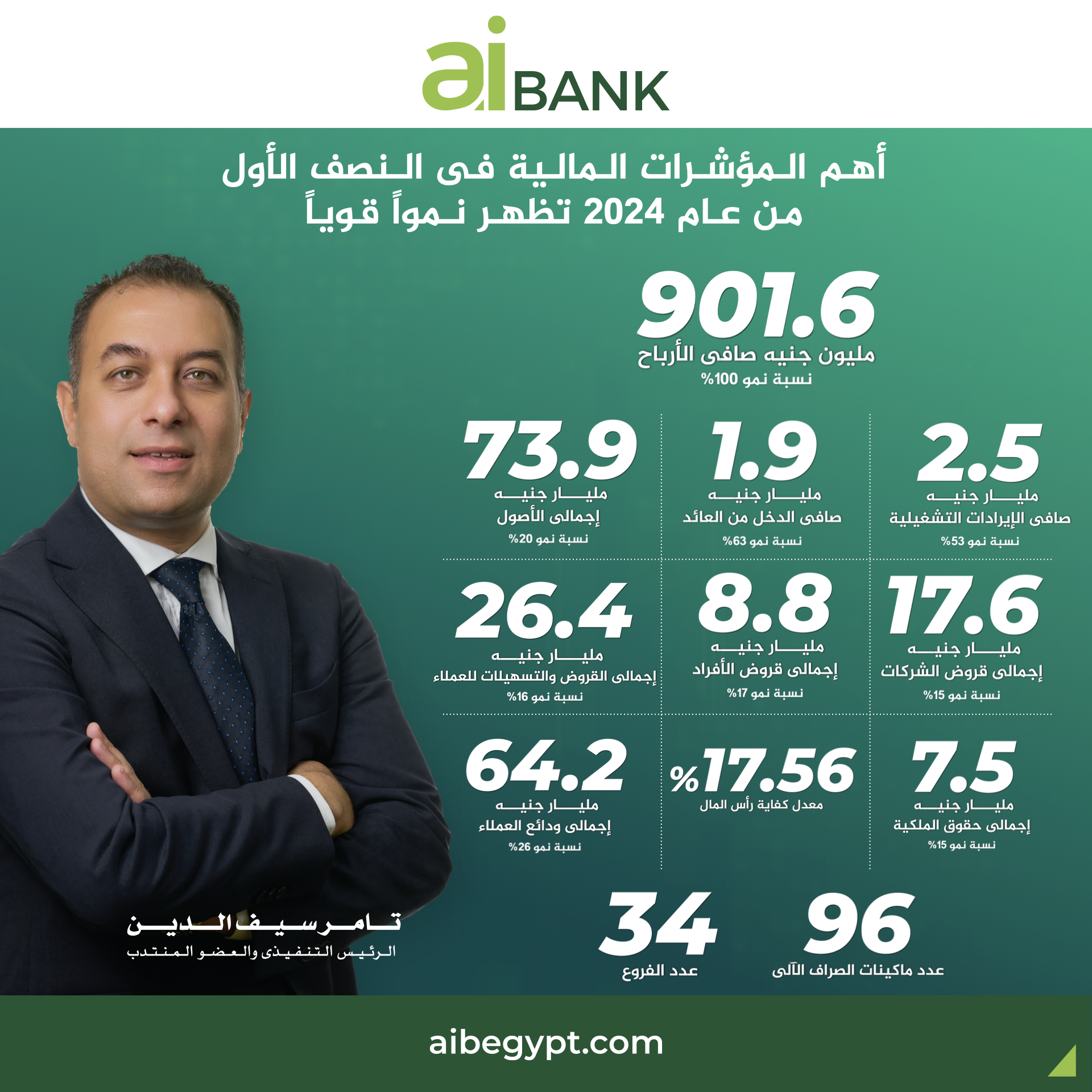 نجح بنك aiBANK في تحقيق نموا قويا وطفرة في الأداء والمؤشرات خلال النصف الأول من العام الجاري 2024.