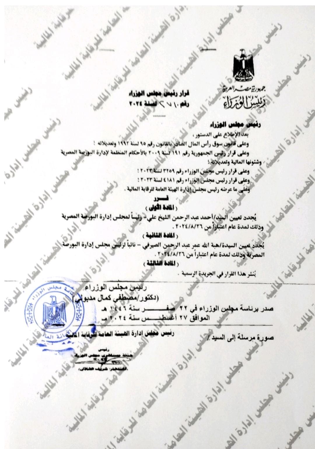 أصدر الدكتور مصطفى مدبولي رئيس مجلس الوزراء قرار رقم 2710 لسنة 2024 بتجديد تعيين أحمد الشيخ رئيسا لمجلس إدارة البورصة المصرية، وتجديد تعيين هبة الصيرفي – نائبا لرئيس مجلس إدارة البورصة المصرية، لمدة عام اعتبارا من 26-أغسطس الجاري.