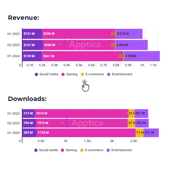 بينما كان قطاع التواصل الاجتماعي هو القطاع الوحيد الذي عانى من انخفاض طفيف في الإيرادات (-1.2٪)، بينما ارتفعت عمليات التنزيل.