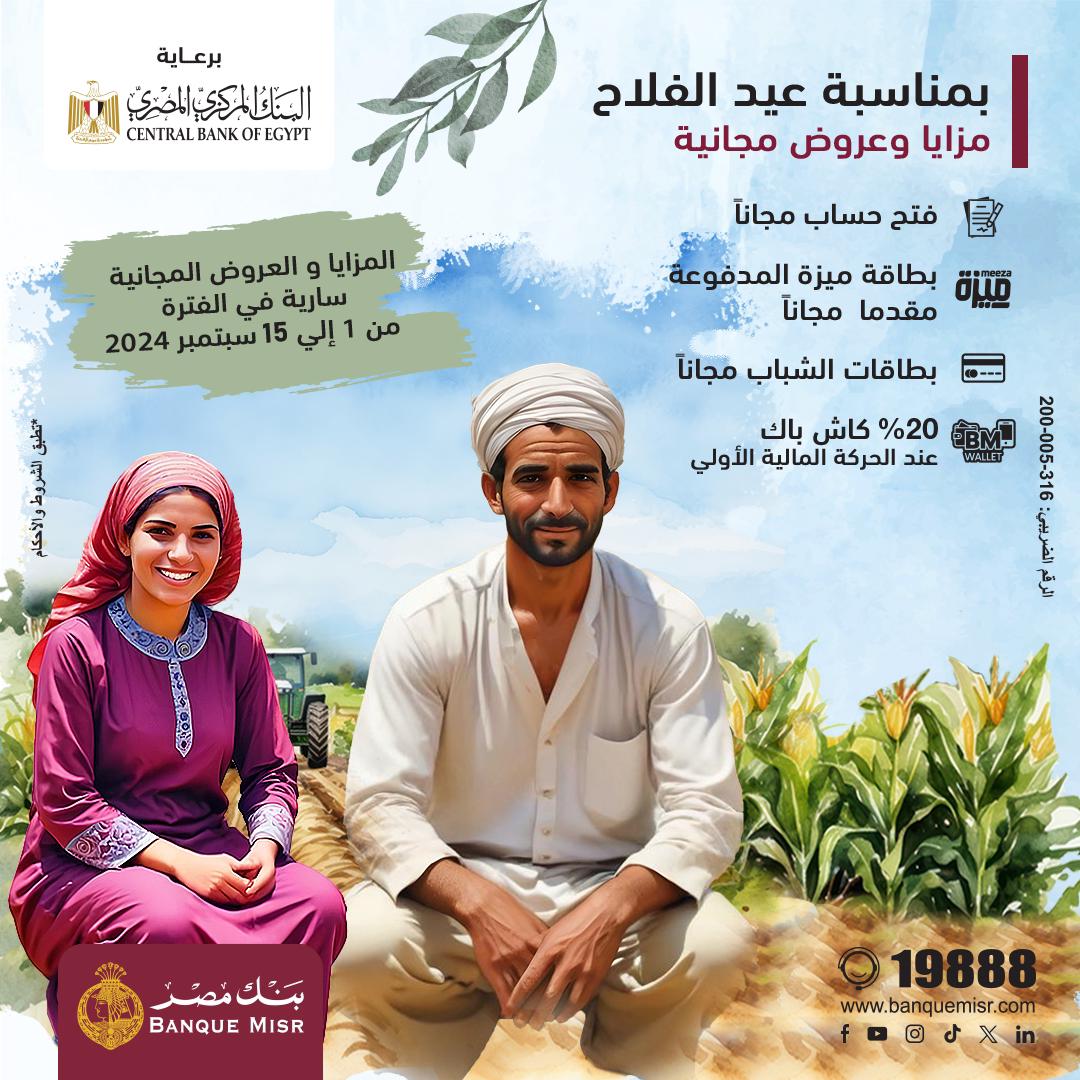 أعلن بنك مصر عن قيامه بتقديم العديد من المزايا والعروض المجانية بمناسبة فاعلية الشمول المالي “عيد الفلاح” تحت رعاية البنك المركزي المصري.