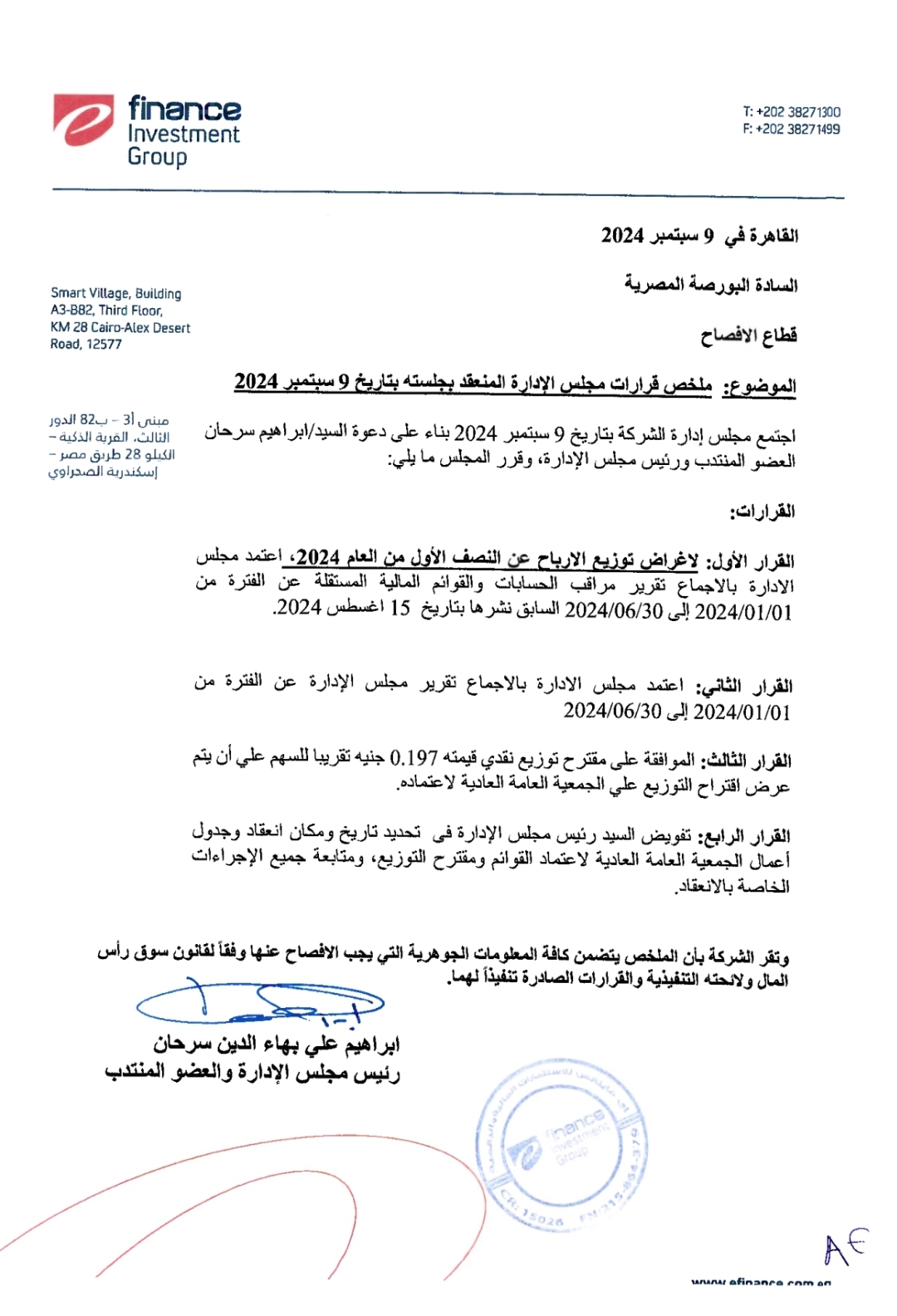 وأضافت الشركة في إفصاح لبورصة مصر، اليوم الثلاثاء، أن المجلس وافق على مقترح توزيع الأرباح عن النصف الأول من العام 2024 بإجمالي 447 مليون جنيه نقدا بواقع 0.197 جنيه تقريبا كوبون نقدي لكل سهم علي أن يتم عرض اقتراح التوزيع علي الجمعية العامة العادية لاعتماده.