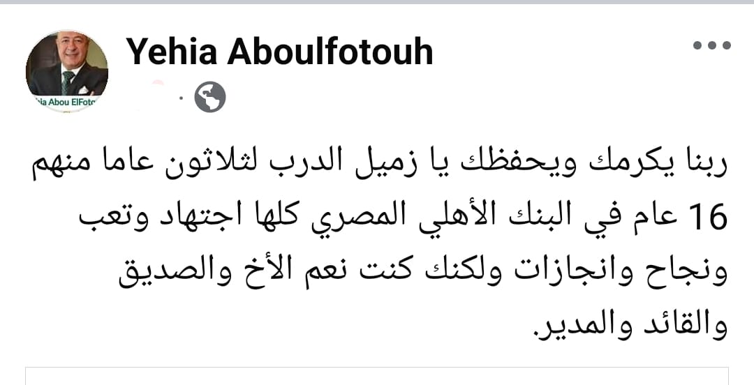 علق يحيي أبو الفتوح نائب رئيس البنك الأهلي المصري على صفحته على موقع التواصل الإجتماعي الفيسبوك على إنتقال هشام عكاشة من رئاسة البنك الأهلي إلى رئاسة بنك مصر في رسالة مؤثرة.