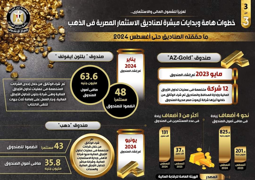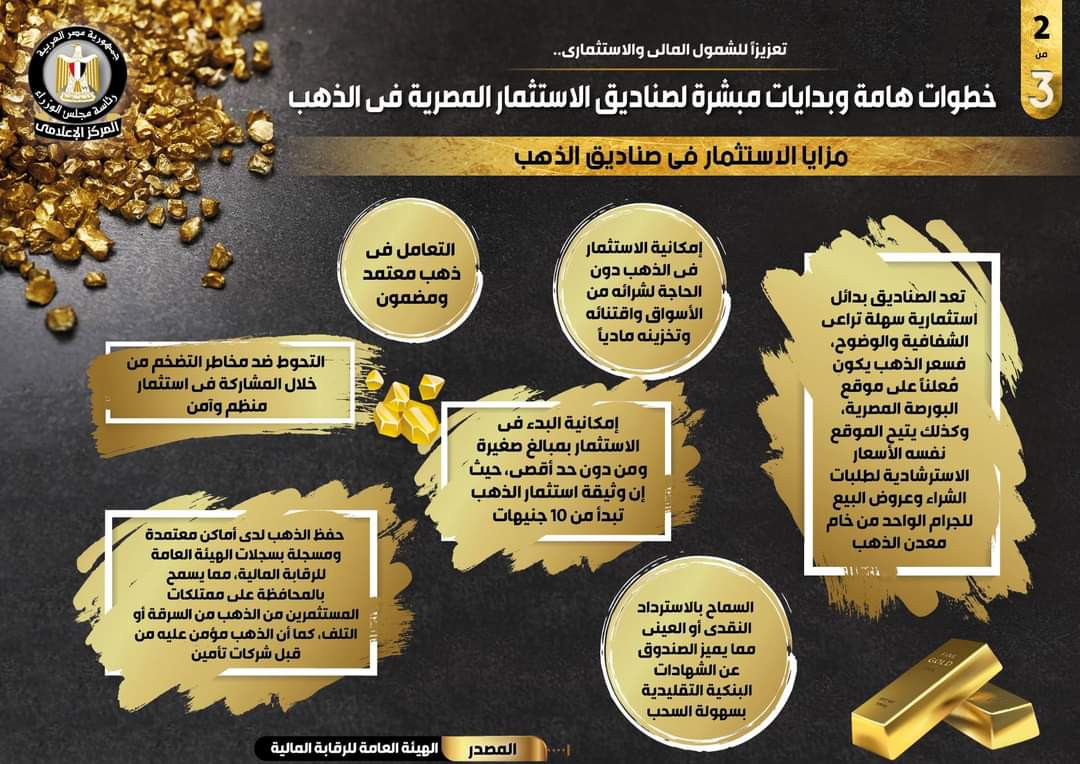وفي هذا الصدد نشر المركز الإعلامي لمجلس الوزراء تقريراً تضمن إنفوجرافات تسلط الضوء على الخطوات الهامة والبدايات المبشرة لصناديق الاستثمار المصرية في الذهب، تعزيزًا للشمول المالي والاستثماري.