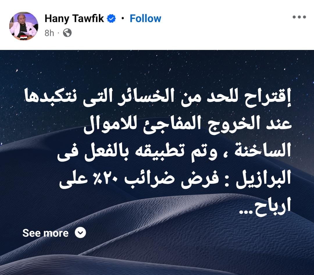 “إقتراح للحد من الخسائر التى نتكبدها عند الخروج المفاجئ للاموال الساخنة ، وتم تطبيقه بالفعل فى البرازيل : فرض ضرائب ٢٠٪ على ارباح الاموال الساخنة ،التى تغادر البلد بارباح فوق العادية، قبل مرور ٣ سنوات من دخولها” .