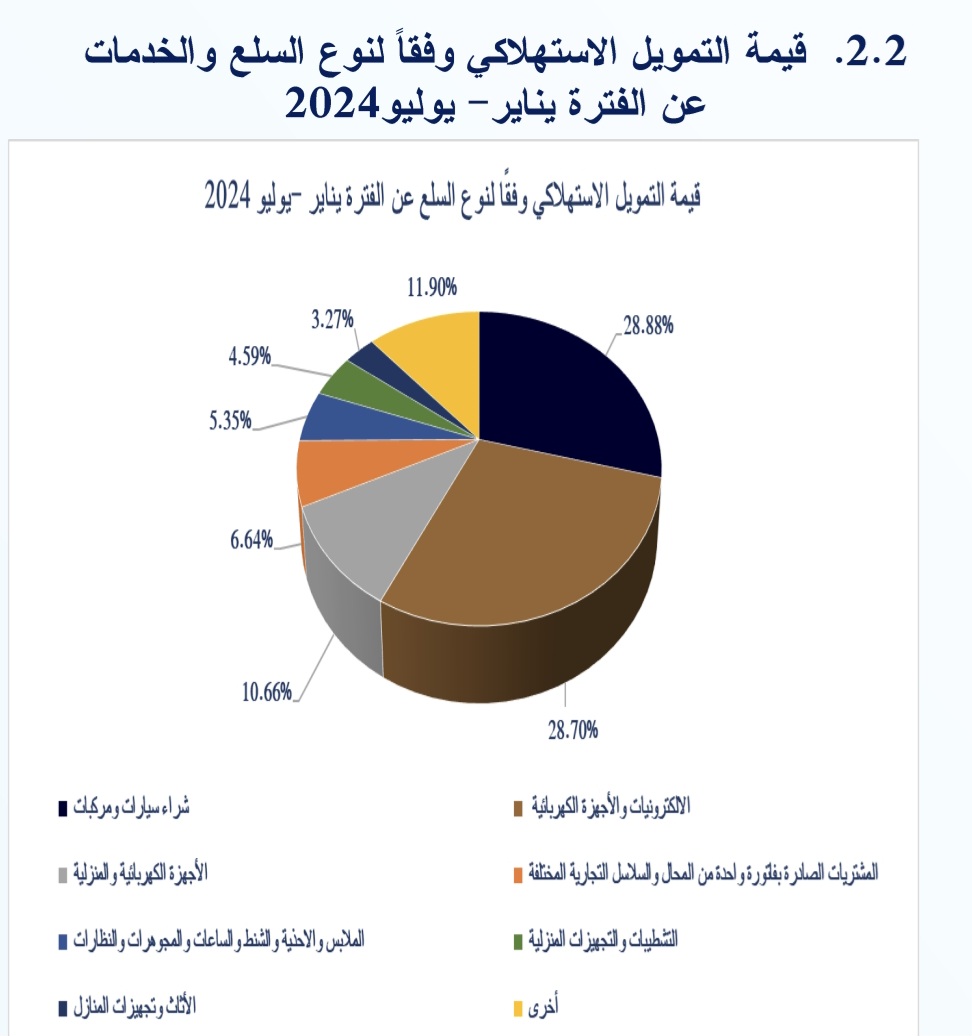 وأضاف التقرير أن ” شراء سيارات ومركبات ” تصدرت قائمة السلع والخدمات التي يتم تمويلها خلال 7 شهور مستحوذة على28.70% من إجمالي التمويلات، تلاها في المرتبة الثانية” الالكترونيات والأجهزة الكهربائية” مستحوذة على 28.88% وجاءت “اخرى ” في المرتبة الثالثة بنحو 11.90% تلاها في المرتبة الرابعة “الأجهزة الكهربائية والمنزلية” والتى استحوذت على 10.66% من إجمالي التمويلات .