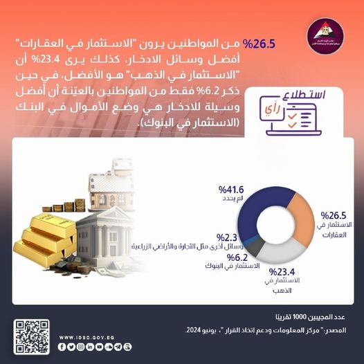 وبلغ عدد الاستجابات الفعلية 1000 استجابة تقريبًا، وقد رأى 26.5% من المواطنين “الاستثمار في العقارات” كأفضل وسائل الادخار، كذلك رأى 23.4% أن “الاستثمار في الذهب” هو الأفضل، في حين ذكر 6.2% فقط من المواطنين بالعيّنة أن أفضل وسيلة للادخار هي وضع الأموال في البنك (الاستثمار في البنوك).