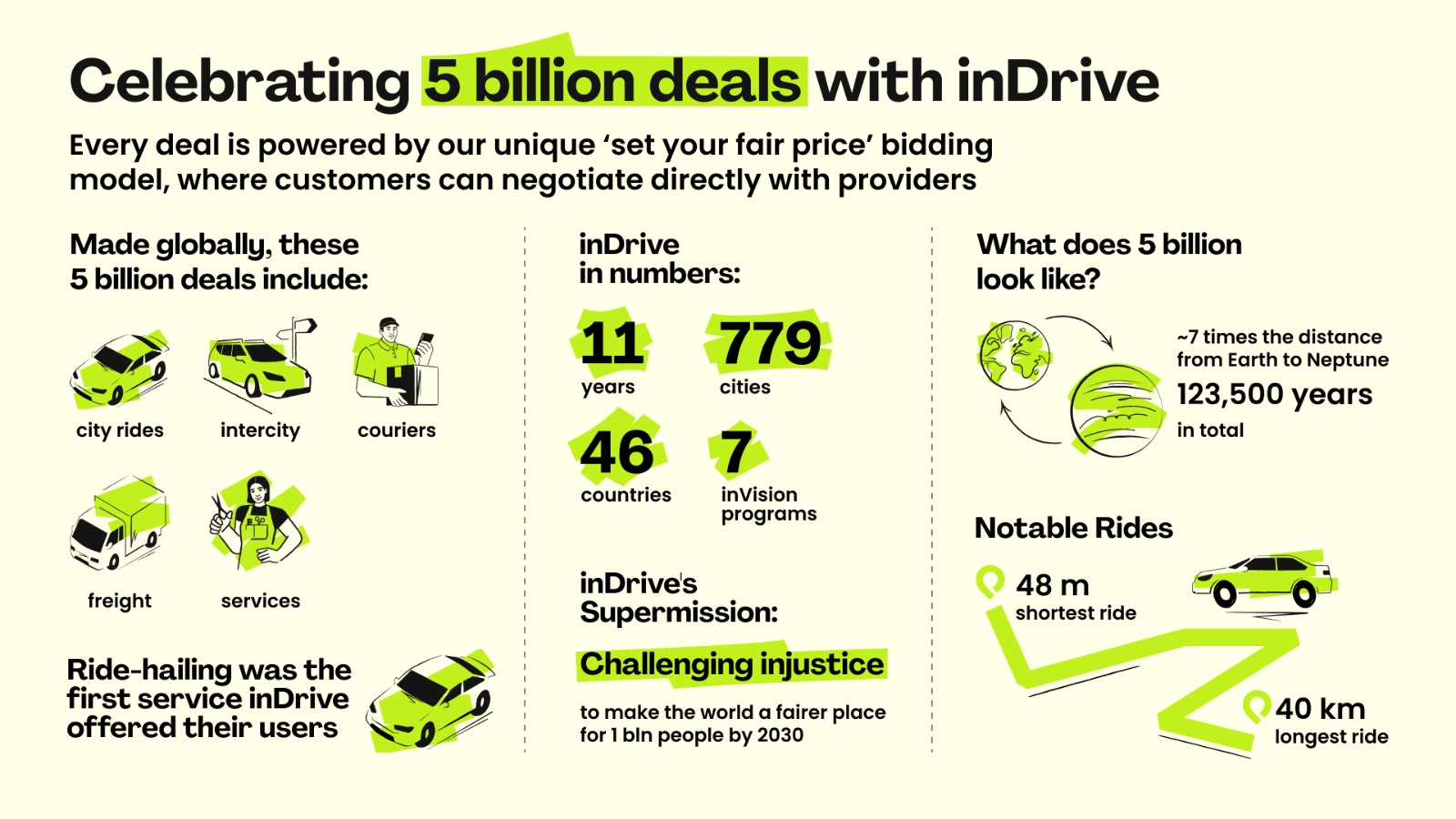 inDrive is celebrating a major milestone: the completion of 5 billion deals on its global mobility and urban services platform as of September, 2024.