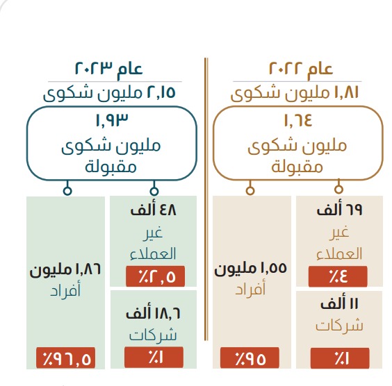 وجاءت الزيادة في أعداد الشكاوى خلال عام 2023، نتيجة زيادة نسب الشمول المالي وبالأخص عدد عملاء البنوك من 42.3 إلى 46.9 مليون عميل بنسبة 10.7% عن العام السابق بما يعكس تعزيز ثقتهم بالقطاع المصرفى.