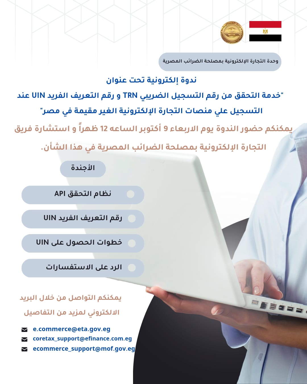 أعلنت وحدة التجارة الإلكترونية بمصلحة الضرائب المصرية عن تنظيم ندوة أونلاين تحت عنوان: “خدمة التحقق من رقم التسجيل الضريبي TRN ورقم التعريف الفريد UIN عند التسجيل على منصات التجارة الإلكترونية الغير مقيمة في مصر.”