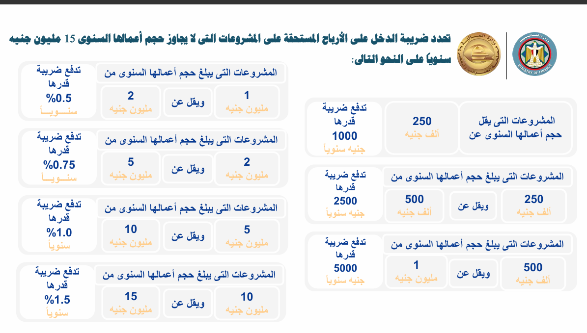 وكشفت الوثيقة أن المحفزات الضريبة تحدد ضريبة الدخل على الأرباح المستحقة على المشروعات التي يقل أعمالها عن 15 مليون جنيه، حيث تبلغ قيمة الضريبة 1000 جنيه فقط على المشروعات التي يقل أعمالها عن 250 ألف جنيه، و2500 جنيه على تلك التي أعلى من 250 ألف جنيه وحتى أقل من 500 ألف حنيه، و5 ألاف جنيه على التي تصل حجم أعمالها 500 ألف وحتى مليون جنيه وجاءت الضريبة كالتالي: