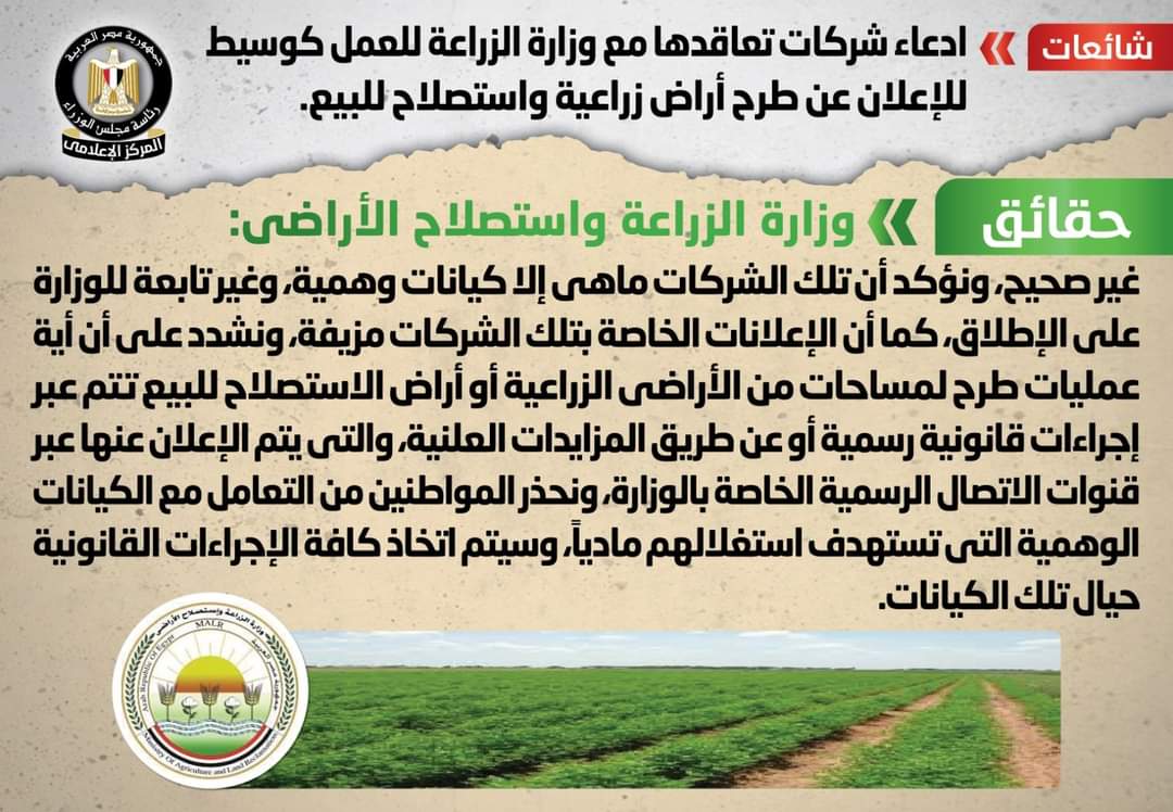 وأوضح بالتواصل مع وزارة الزراعة واستصلاح الأراضي، والتي نفت تلك الأنباء، مُؤكدةً أنه لا صحة لتعاقد الوزارة مع شركات للعمل كوسيط للإعلان عن طرح أراض زراعية واستصلاح للبيع، وأن تلك الشركات ماهي إلا كيانات وهمية، وغير تابعة للوزارة على الإطلاق، كما أن الإعلانات الخاصة بتلك الشركات مزيفة.