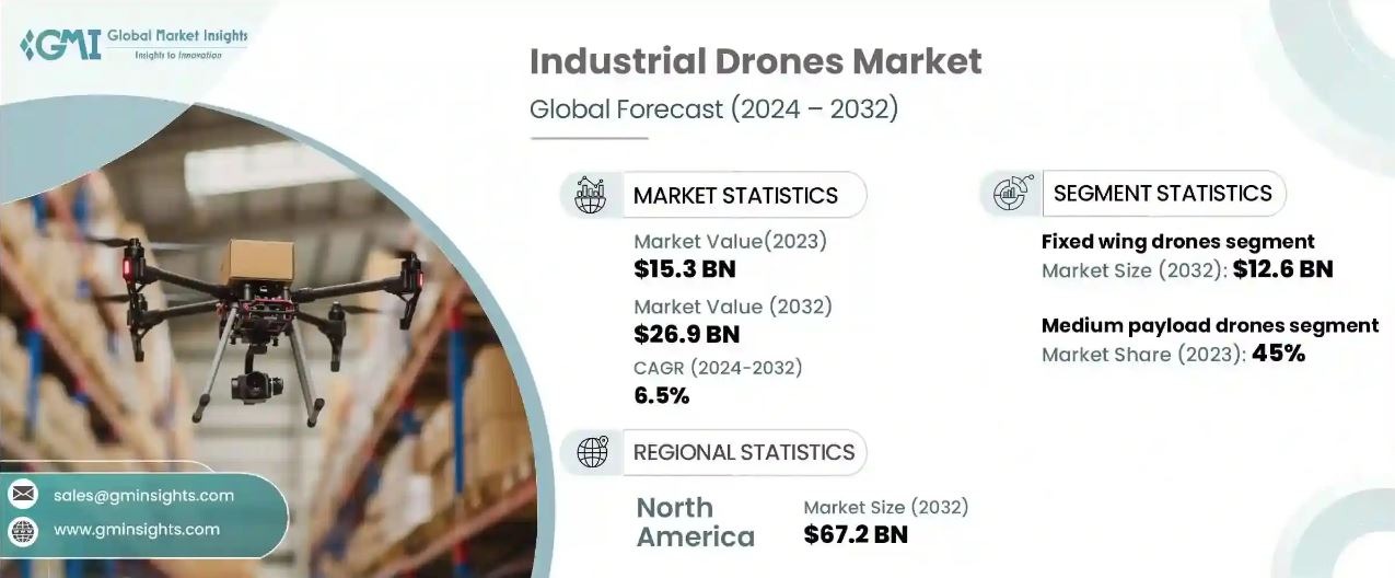توقعت دراسة صادرة عن Global Market Insights، أن يصل حجم سوق الطائرات الصناعية بدون طيار إلى 26.9 مليار دولار بحلول عام 2032، مدفوعاً بالتطورات التكنولوجية في أجهزة الاستشعار والكاميرات مثل التصوير عالي الدقة، *LiDAR*، والكاميرات الحرارية.