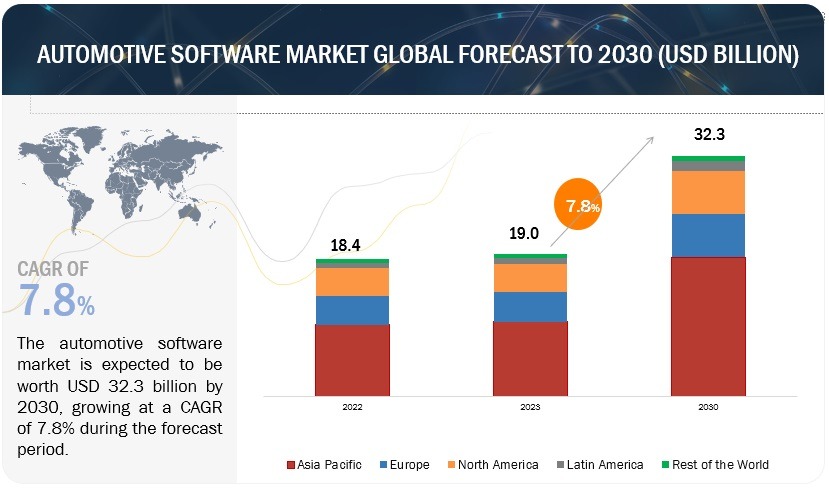 وفقًا لدراسة حديثة أجرتها شركة MarketsandMarkets للأبحاث، فإنه من المتوقع أن يرتفع حجم سوق برمجيات السيارات من 19.0 مليار دولار أمريكي في عام 2023 إلى 32.3 مليار دولار أمريكي بحلول عام 2030، بمعدل نمو سنوي مركب يبلغ 7.8%.