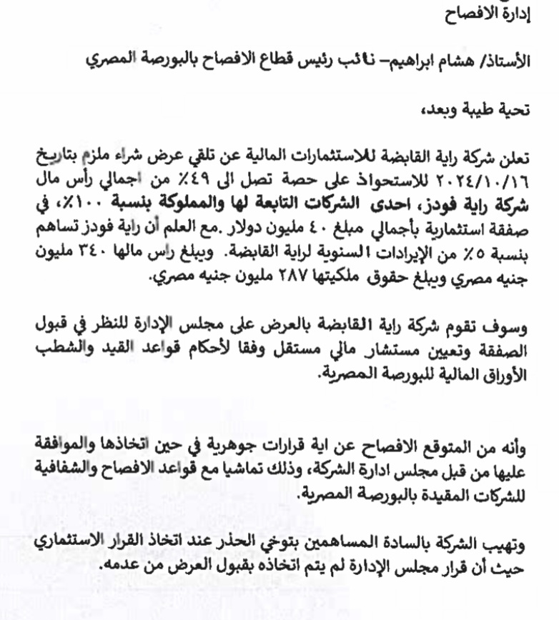 أعلنت البورصة المصرية تلقيها خطابا من شركة راية القابضة للاستثمارات المالية يفيد تلقيها عرض شراء ملزم للاستحواذ على حصة من إجمالى أسهم رأس مال شركة راية فودز (احدى شركات التابعة والمملوكة بنسبة 100%) فى صفقة استثمارية.