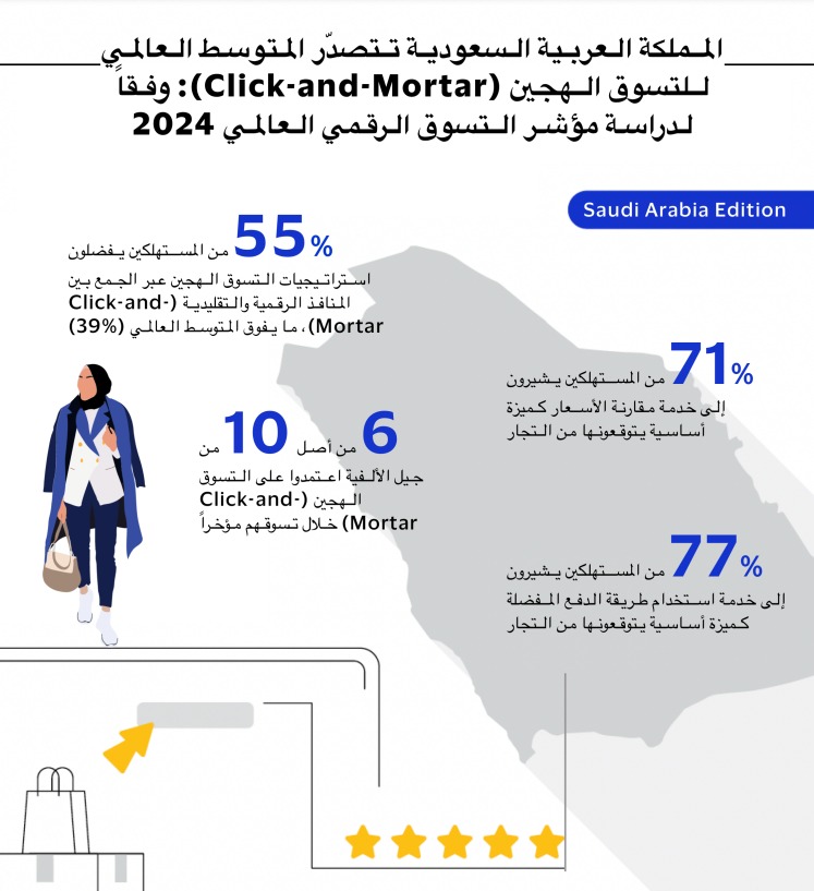 وأضاءت دراسة “مؤشر التسوق الرقمي العالمي 2024: إصدار المملكة العربية السعودية” على نموّ هذا التوجه بشكل خاص لدى المتسوقين من جيل الألفية في المملكة العربية السعودية، حيث ذكر نحو 6 من أصل 10 أنهم تسوقوا مؤخراً باعتماد نهج التسوّق الهجين عبر الجمع بين المنافذ الرقمية والتقليدية (Click-and-Mortar).