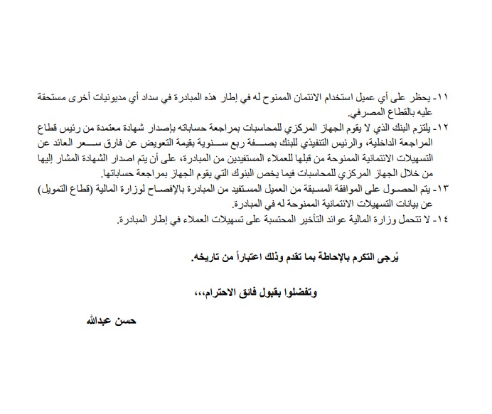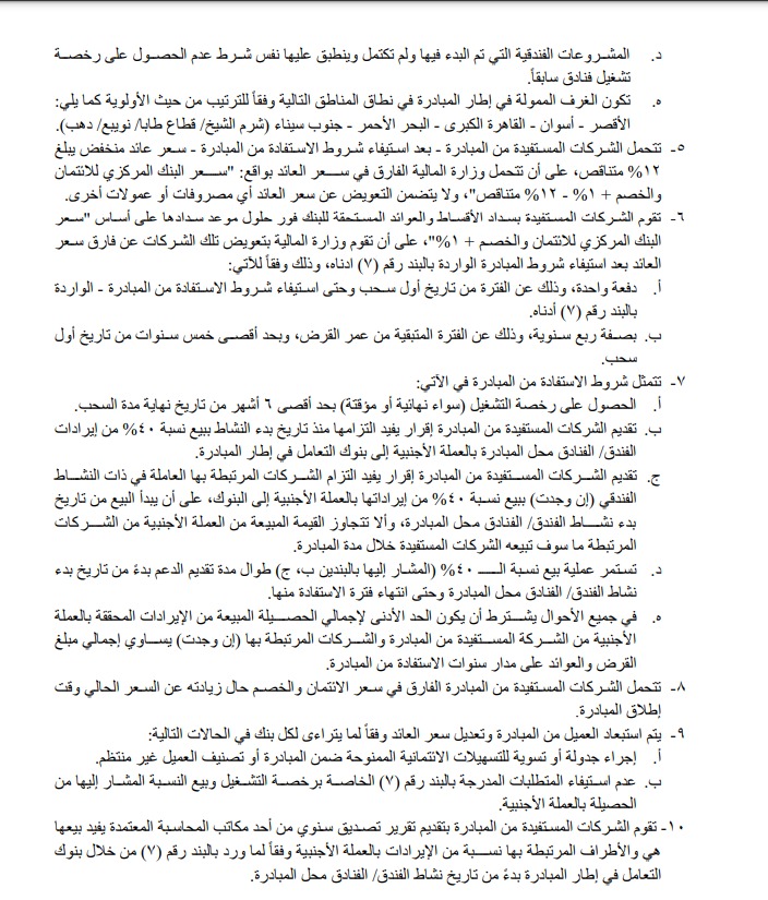 وتضمنت الشروط تحديد حجم الائتمان المتاح لكل شركة في ضوء حجم أعمالها والقواعد المصرفية المنظمة، على ألا يتجاوز الحد الأقصى لتمويل العميل الواحد مبلغ مليار جنيه، ولتمويل العميل الواحد والأطراف المرتبطة به مبلغ 2 مليار جنيه – وذلك باستثناء ما ورد بالبند رقم (٤) – (ب)، وذلك من خلال بنكين فقط كحد أقصى في إطار المبادرة، ويتم تسجيل بيانات العميل على النظام الإلكتروني الخاص بالمبادرة بالبنك المركزي لإحكام الرقابة على ذلك الحدود، ويجوز لوزير المالية ووزير السياحة والآثار مجتمعين استثناء بعض العملاء من الحد الأقصى، وذلك بالنسبة للمشروعات ذات الأهمية الاستراتيجية، بموجب خطاب موقع من وزارة المالية وموجه إلى البنك المركزي.