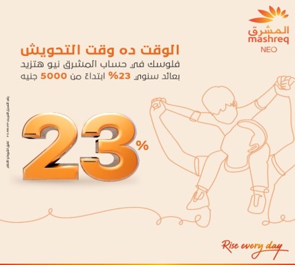 أطلق بنك المشرق مصر حملة جديدة على حسابات Mashreq NEO وe&Mashreq NEO، تقدم معدل فائدة تنافسي بنسبة 23% ابتداءً من رصيد 5,000 جنيه مصري، مما يجعلها الخيار الأمثل للادخار.