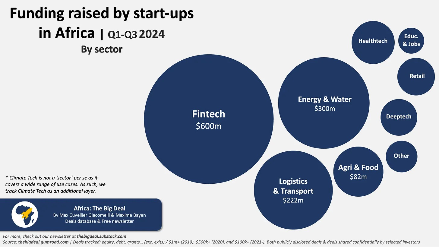 وجاء قطاع النقل والخدمات اللوجستية في المركز الثالث مدفوعاً بصفقات moove بـ 110 مليون دولار وSpiro بـ 50 مليون دولار في النصف الأول من العام. كما أن الاستثمارات التي يمكن تصنيفها كـ “تكنولوجيا مناخية” استحوذت على حوالي 35% من التمويل في الربع الثالث، وهو ما يتماشى مع الأرقام الإجمالية لعام 2024 حتى الآن، حيث تم استثمار أكثر من نصف مليار دولار في مشاريع متعلقة بالمناخ في أفريقيا هذا العام، متسقةً مع نسبة الربع الأول إلى الثالث من عام 2023.