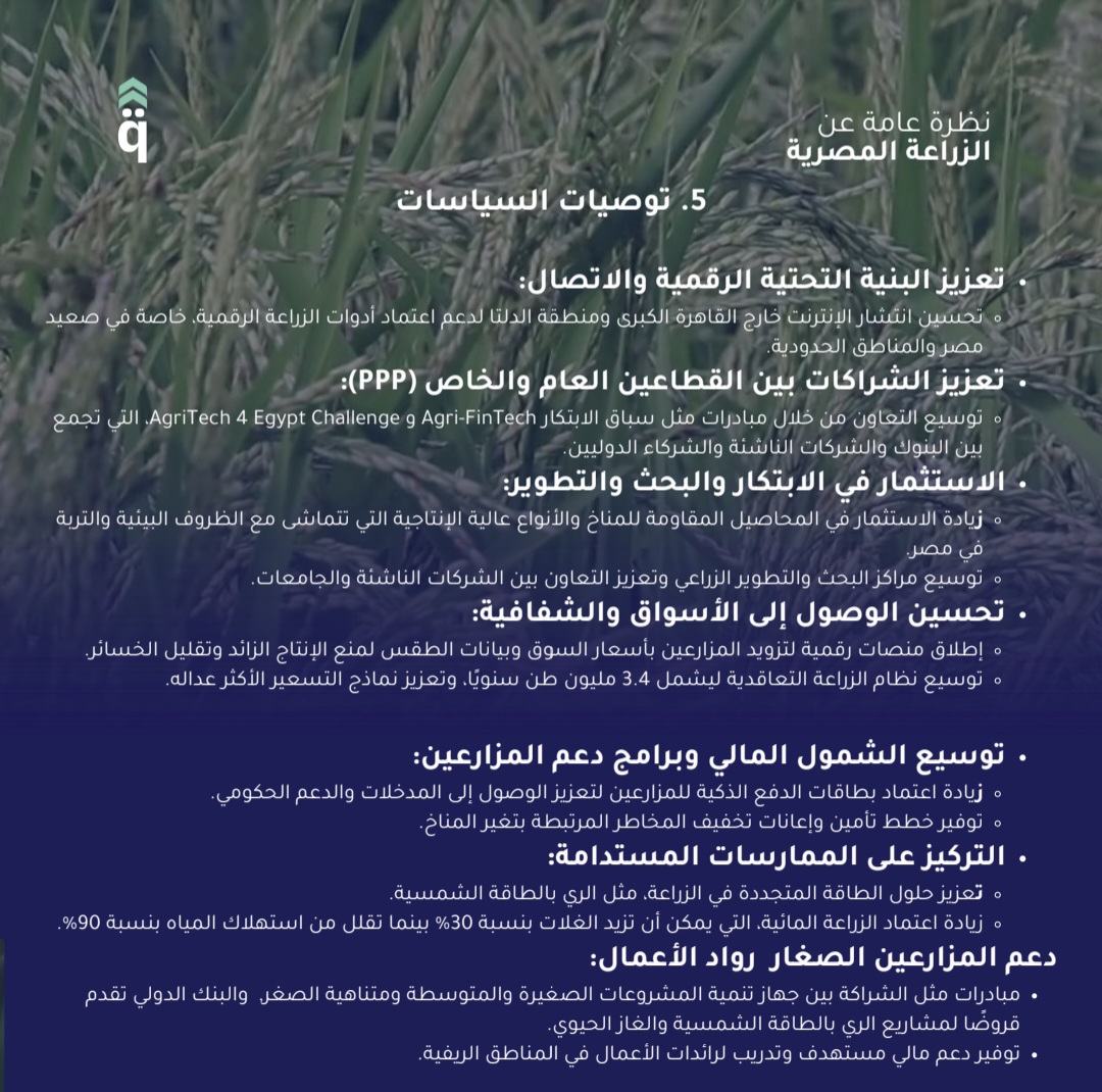 كما طالب بتعزيز الشراكات بين القطاعين العام والخاص (PPP) من خلال توسيع التعاون من خلال مبادرات مثل سباق الابتكار AgriTech 4 Egypt Challenge g Agri-FinTech بين البنوك والشركات الناشئة والشركاء الدوليين.