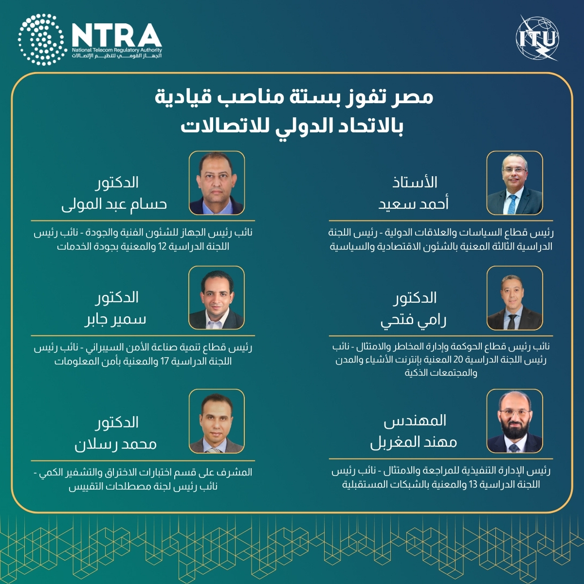 جاء ذلك خلال مشاركة الوفد المصري برئاسة المهندس محمد شمروخ الرئيس التنفيذي للجهاز، حيث فازت برئاسة اللجنة الدراسية الثالثة المعنية بالشئون الاقتصادية والسياسية، كما حصلت على مناصب نائب رئيس اللجنة الدراسية الـ 12 المعنية بجودة الخدمات، ونائب رئيس اللجنة الدراسية الـ 13 المعنية بالشبكات المستقبلية، ونائب رئيس اللجنة الدراسية الـ 17المعنية بأمن المعلومات، ونائب رئيس اللجنة الدراسية الـ 20 المعنية بإنترنت الأشياء والمدن والمجتمعات الذكية، ونائب رئيس لجنة مصطلحات التقييس.