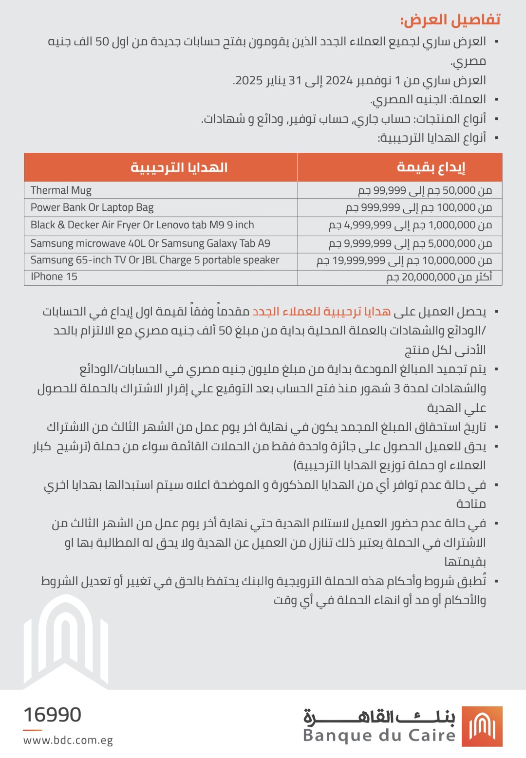 وأضاف يتم تجميد المبالغ المودعة بداية من مبلغ مليون جنيه مصري في الحسابات / الودائع والشهادات لمدة 3 شهور منذ فتح الحساب بعد التوقيع على إقرار الاشتراك بالحملة للحصول على الهدية.