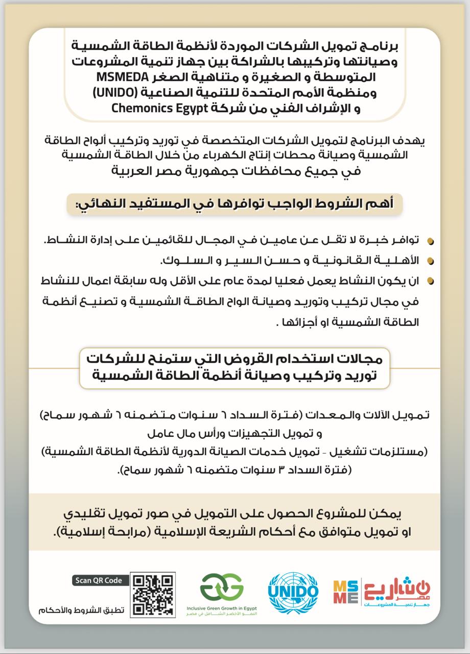 ودعا رحمي جميع المشروعات الصغيرة والمتوسطة العاملة في مجال تركيب وتجارة وتوريد وصيانة وتصنيع أنظمة الطاقة الشمسية بكافة محافظات الجمهورية للاستفادة من المنتج التمويلي الجديد من خلال التقدم لأحد أفرع الجهاز المنتشرة على مستوي الجمهورية .