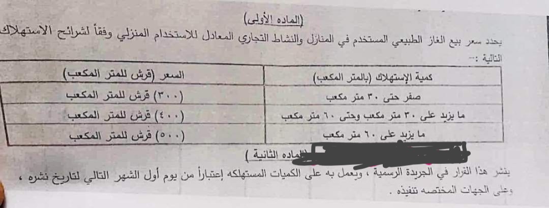 وجاءت أسعار الغاز الطبيعي المستخدم في المنازل والنشاط التجاري المعادل للاستخدام المنزلي، وفقا لشرائح الاستهلاك التالية: