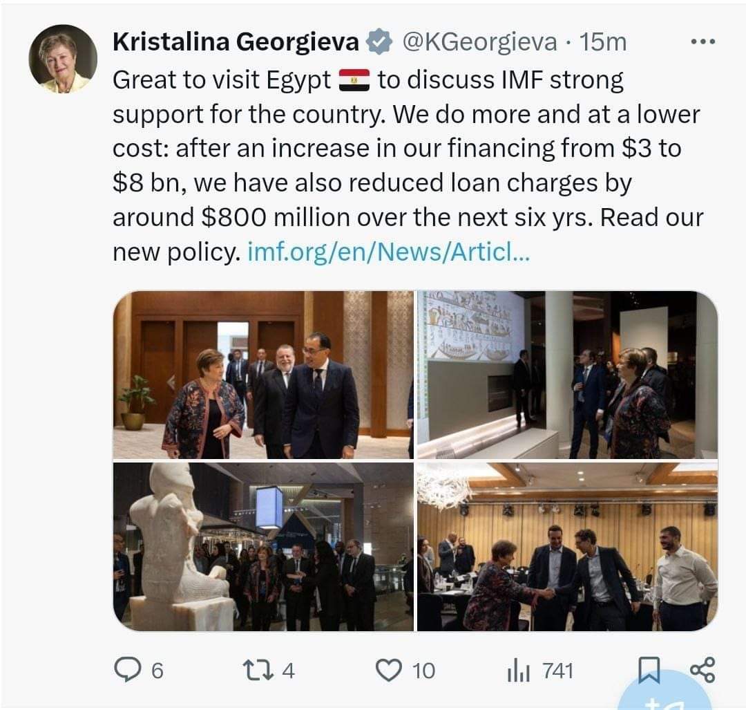 قالت كريستالينا جيورجيفا، المدير العام لصندوق النقد، إن الصندوق يعمل على تقديم مزيد من الدعم القوي لمصر وبتكلفة أقل.