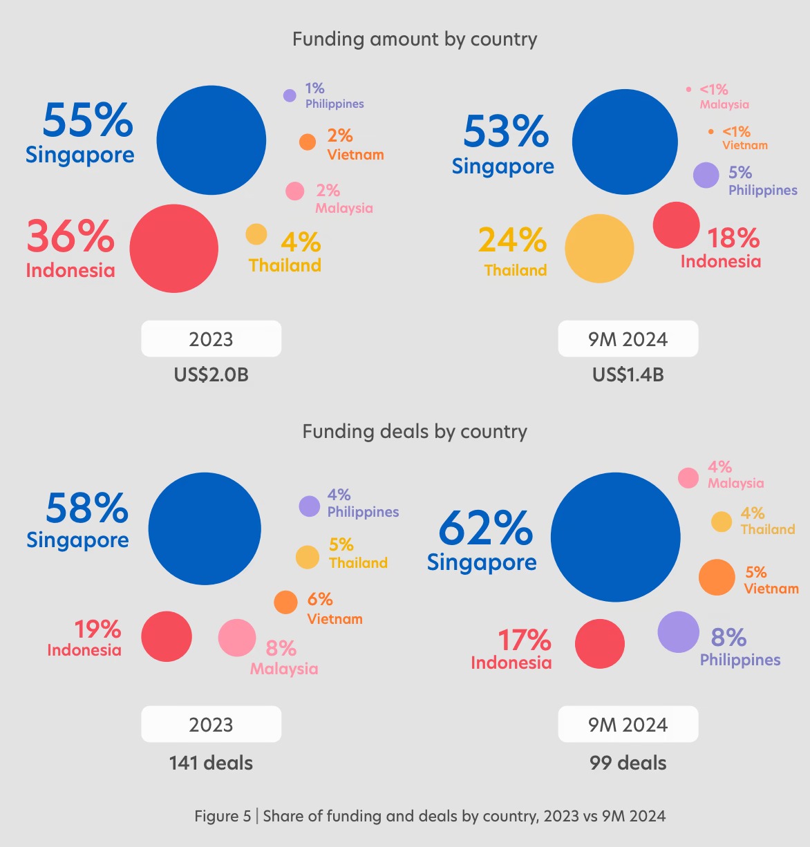 وقادت سنغافورة قطاع التمويل في جنوب شرق آسيا، مستحوذةً على 53% من التمويل وعدد صفقات يصل إلى 62%. ارتفعت تايلاند إلى المرتبة الثانية بفضل صفقة تمويل بقيمة 195 مليون دولار أمريكي من “أسند موني”، بينما تراجعت إندونيسيا إلى المرتبة الثالثة.