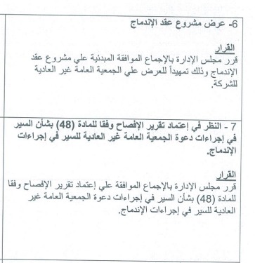 وافق المجلس بالإجماع على عرض مشروع عقد الاندماج على الجمعية العامة غير العادية للحصول على الموافقة النهائية. كما تم اعتماد تقرير الإفصاح وفق المادة (48) من اللوائح التنظيمية، تمهيدًا للإعلان الرسمي ودعوة المساهمين للتصويت.
