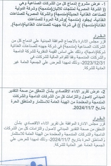 وافق مجلس ادارة شركة جهينة للصناعات الغذائية على مشروع اندماج يشمل الشركة المصرية لتعبئة الألبان وشركات دولية أخرى شقيقة، بما في ذلك الشركة الدولية للصناعات الغذائية، مع جهينة للصناعات الغذائية.