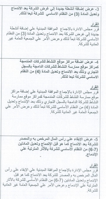 وقرر المجلس تعديل النظام الأساسي للشركة لإضافة أنشطة جديدة تتماشى مع خطط النمو المستقبلية بعد الاندماج وتعدل المادة 3 من النظام الأساسي للشركة.