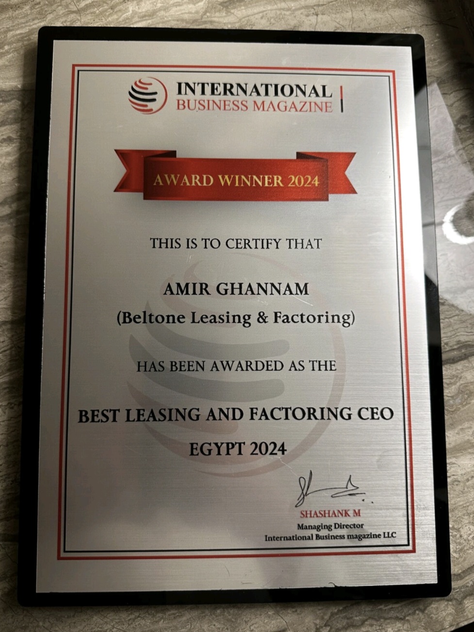 حصل أمير غنّام، الرئيس التنفيذي لشركة بلتون للتأجير التمويلي والتخصيم، على جائزة “أفضل رئيس تنفيذي في مصر” في قطاع التأجير التمويلي والتخصيم، والتي تمنحها International Business Magazine.