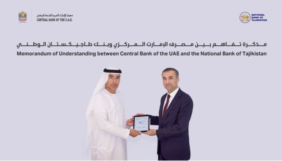 وقع خالد محمد بالعمى، محافظ مصرف الإمارات العربية المتحدة المركزي وتوليبزودا فيردافس نازريمــاد، رئيس مجلس إدارة بنك طاجيكستان الوطني، مذكرة تفاهم لتعزيز الروابط المشتركة وإرساء إطار لتطوير العلاقات الثنائية وتبادل المعلومات والخبرات في المجالات المشتركة.