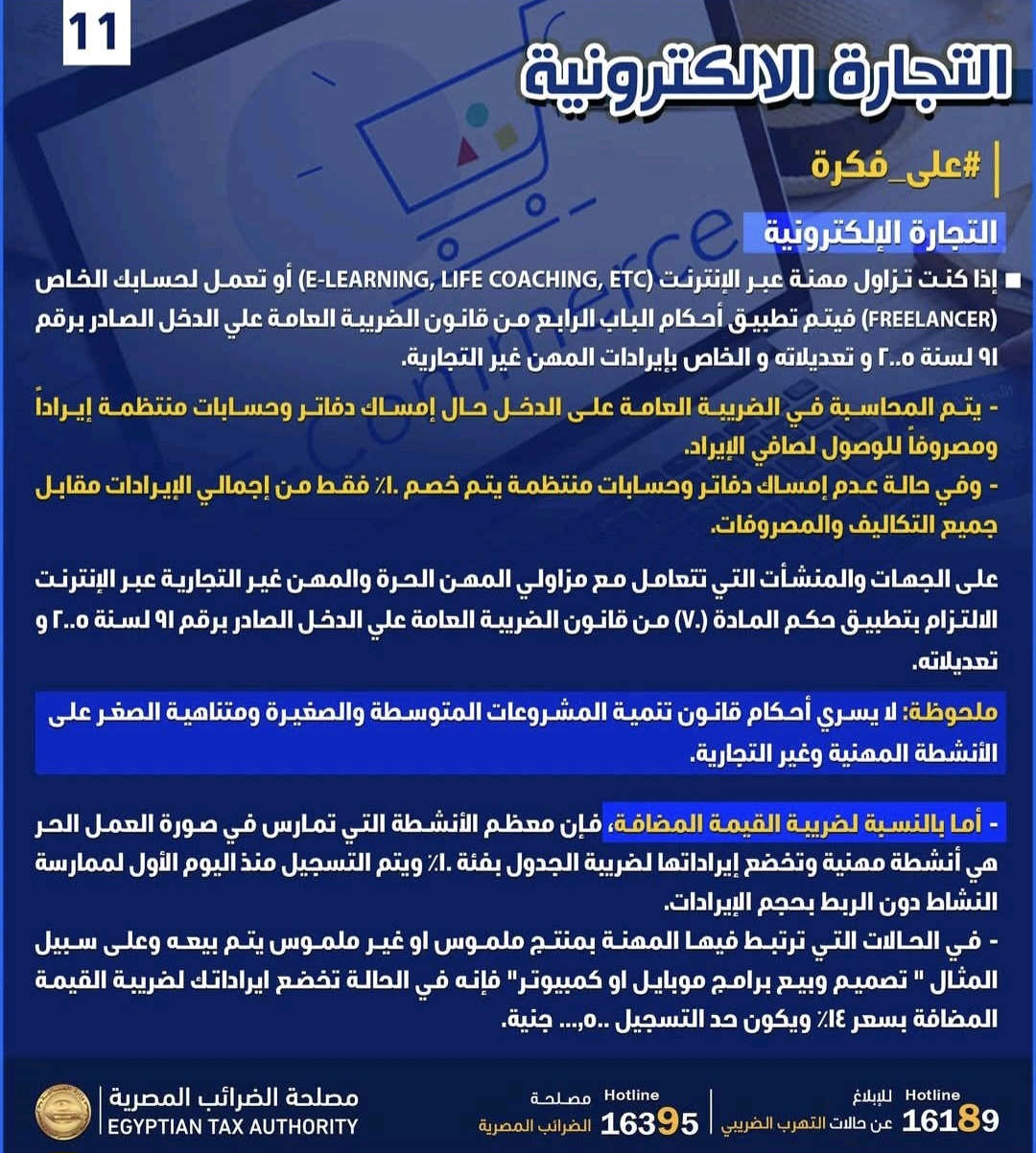 وطالبت بضرورة التوجه لوحدة التجارة الإلكترونية بمصلحة الضرائب في حال وجود أي استفسارات أو الإتصال بالرقم 16395 أو الإتصال على الخط الساخن 16189 في حال البلاغات أو عبر البريد الإلكتروني.
