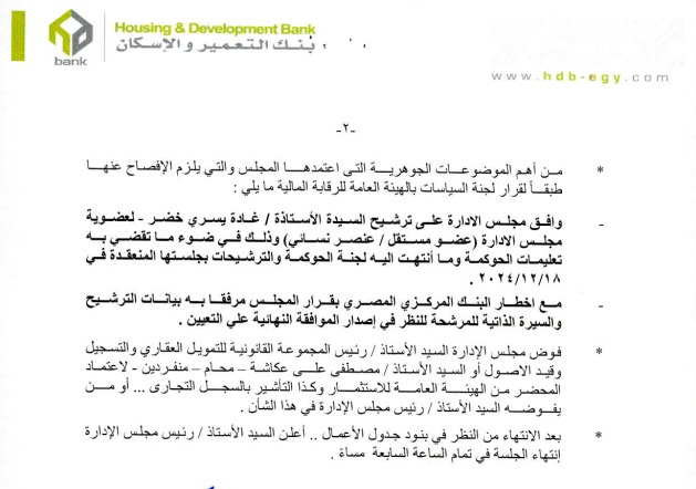 وافق مجلس إدارة بنك التعمير والإسكان خلال اجتماعه الأخير الذي عُقد الخميس الماضى على ترشيح غادة يسري خضر كعضو مستقل بمجلس الإدارة عنصر نسائي.